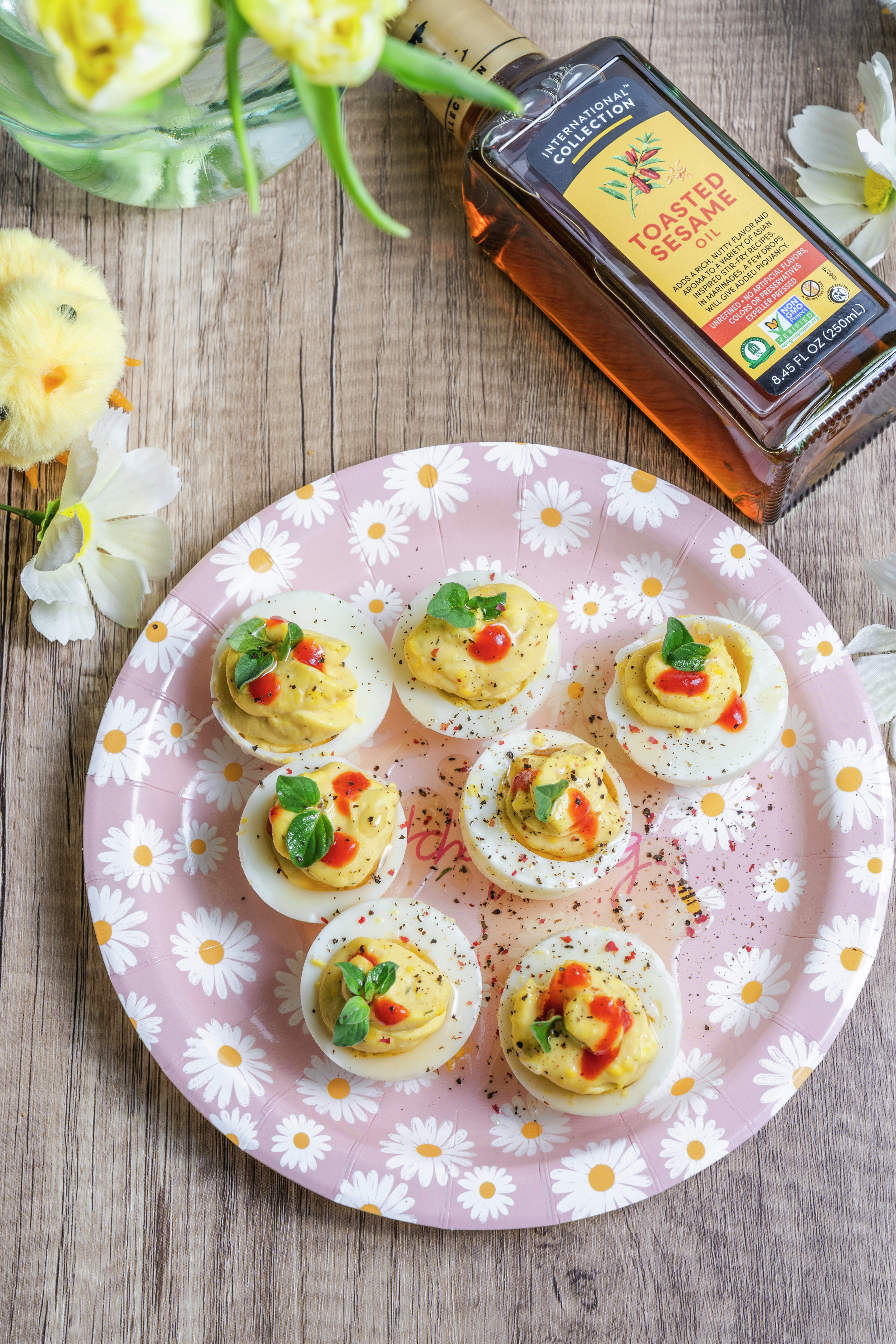 Transform your appetizer game with our Toasted Sesame Sriracha Devilled Eggs, a flavor-packed twist on a classic favorite. Crafted with International Collection Toasted Sesame Oil, these eggs are infused with an irresistible combination of creamy mayo, tangy Greek yogurt, and fiery sriracha. Topped with a sprinkle of furikake seasoning and a drizzle of sesame oil, each bite bursts with savory goodness. Perfect for entertaining or snacking, these devilled eggs are sure to impress!